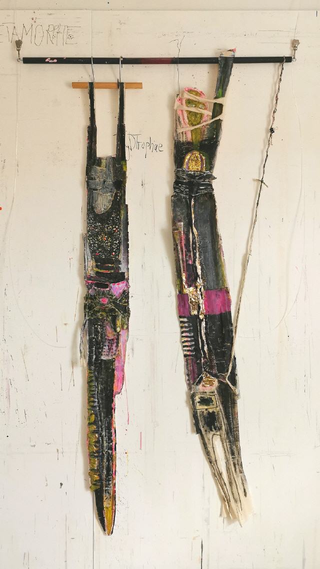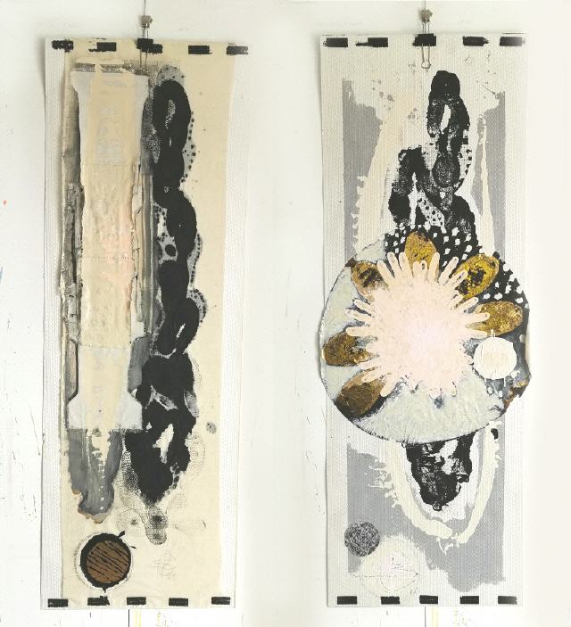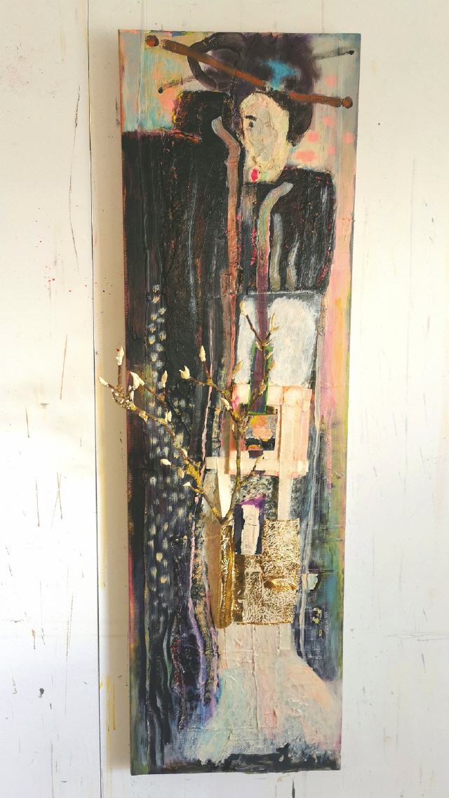 Acryl, Seide, Foliengold auf Vinyltapete/Japanpapier-Rollo